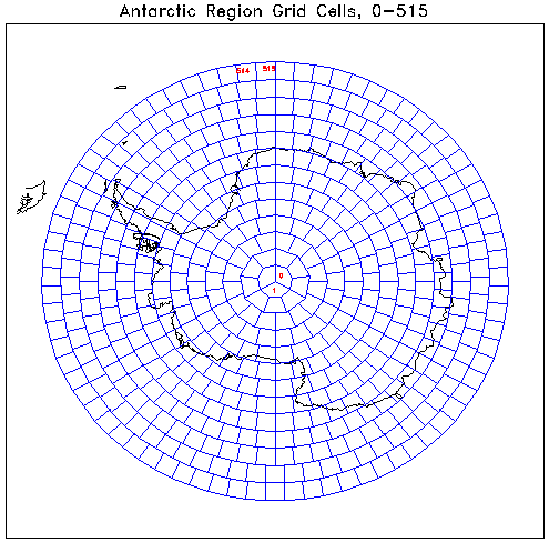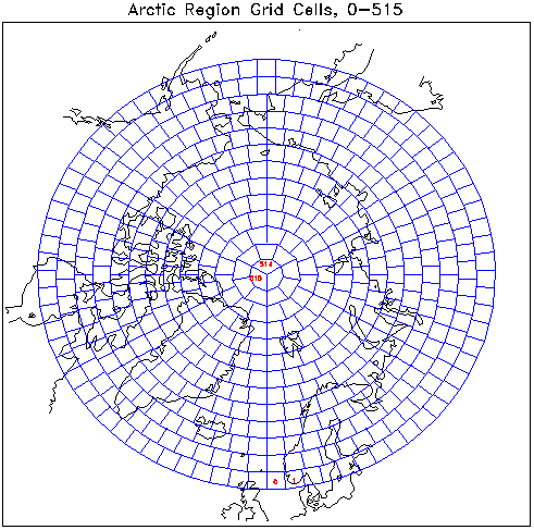 The fluxes are generated every 3 hours for 516 grid cells in each polar region, extending down to 57.5° latitude. The grid structure is an equal area mapping, with cell size defined by the area of a 2.5° × 2.5° region at the equator, giving an equivalent square cell of side 280 km. This is the grid system used by the ISCCP; see their DX/D1/D2 data set documentation for details. The figures below show the cell grids for each pole. Since it is not a square array grid, the output is not formatted as a square array (image) structure; rather, geographic coordinates of each of the 516 locations are provided in a separate array. Note the cell numbers increase in a counter-clockwise spiral towards the pole for the Arctic, and in a clockwise spiral away from the pole in the Antarctic. To download a UNIX compressed (".gz"), postscript file containing grid cell maps with complete numbering please click here.